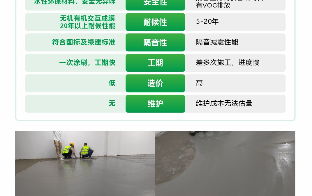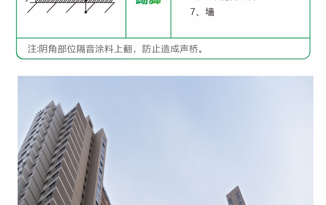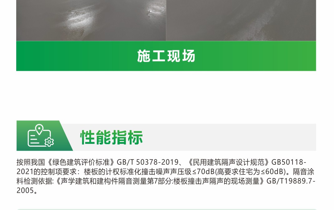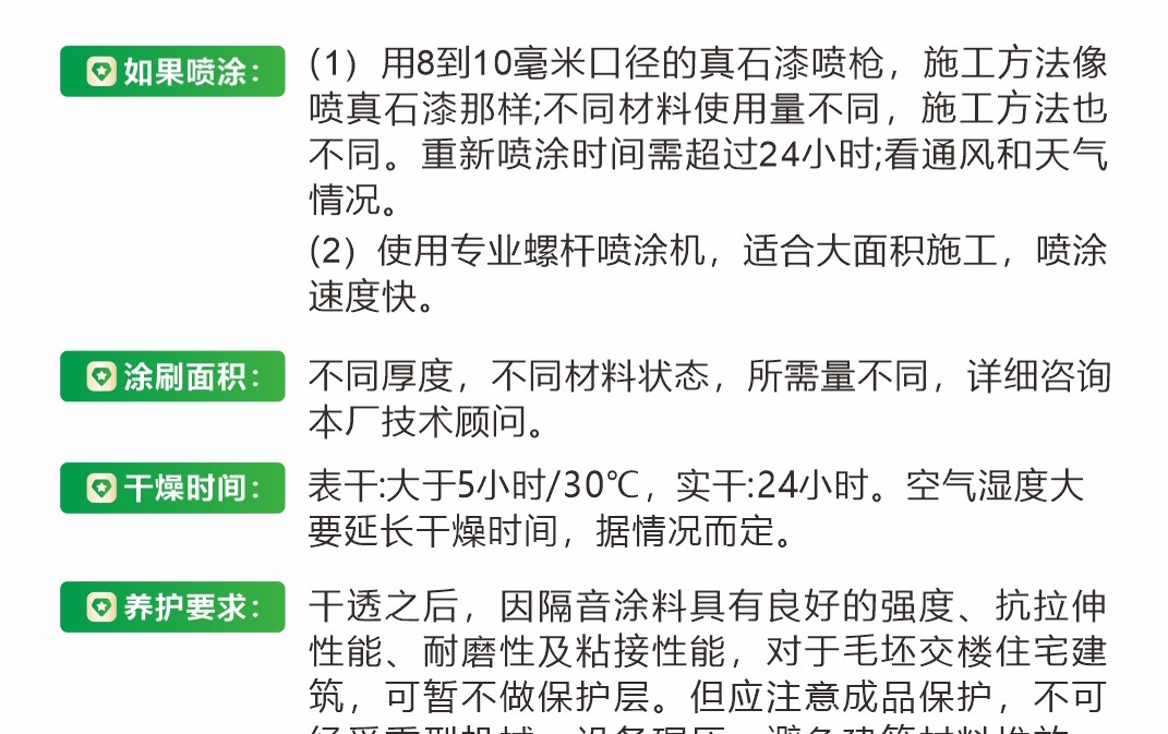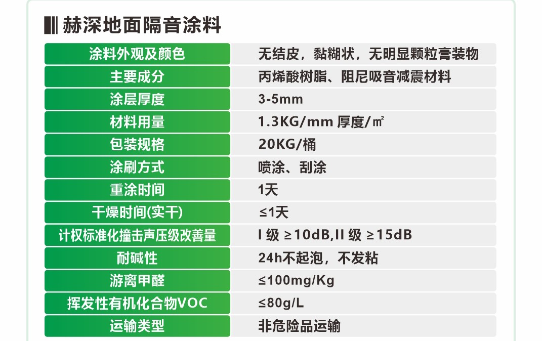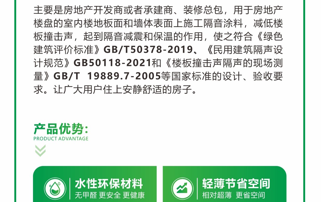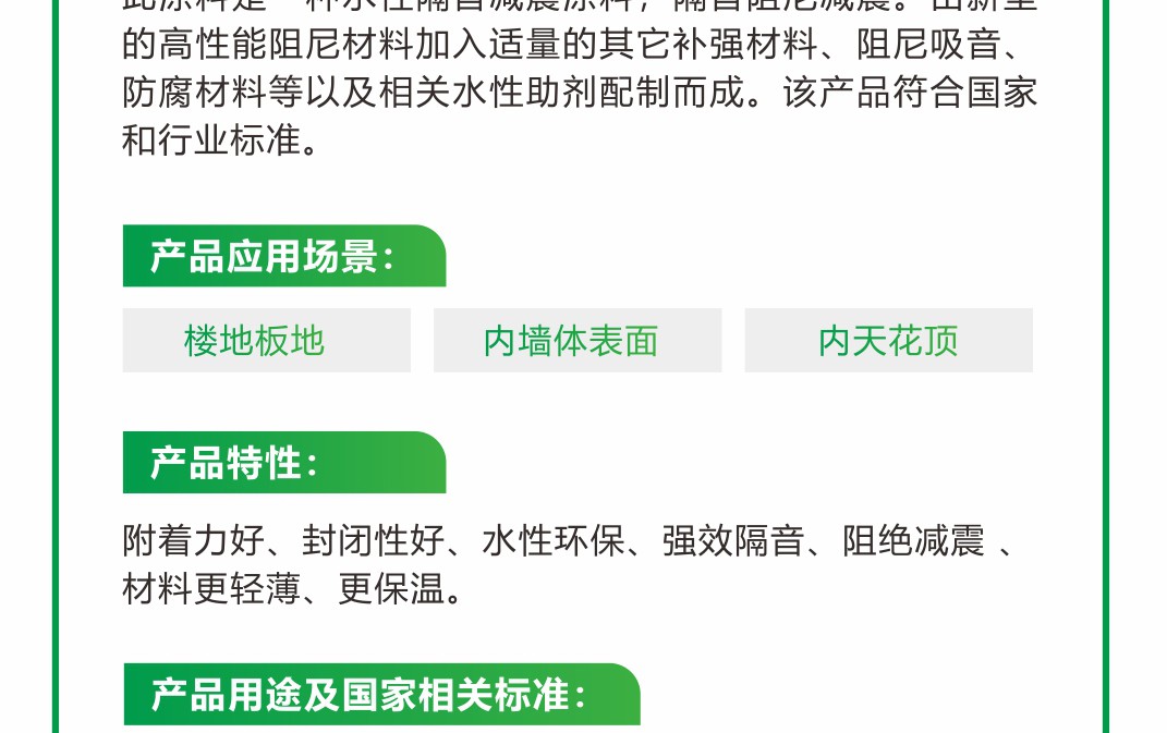 由新型的高性能阻尼材料加入适量的其它补强材料、阻尼吸音、防腐材料等以及相关水性助剂配制而成。该产品符合国家和行业标准。附着力好、封闭性好、水性环保、强效隔音、阻绝减震 、材料更轻薄、更保温。适用于楼地板底、内墙体表面,内天花板顶。